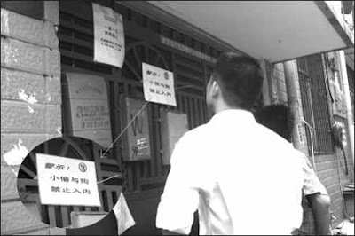 2008年9月2日,在洪山区土库村一栋居民楼挂着一个告示“小偷与狗禁止入内”,附近居民看到后认为此举不妥。房东称,由于近期居民楼被盗现象突出,再加上租户带狗出入影响了其他住户,他贴告示是无奈之举(来自新浪社会新闻长江商报)。